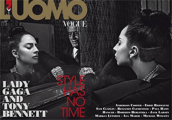 Lady Gaga, Tony Bennett and a woman in the mirror that we can't identify grace the cover of L'uomo Vogue.#LadyGagaStyle Forever!